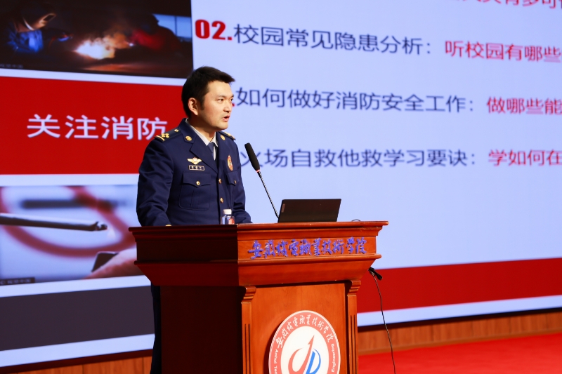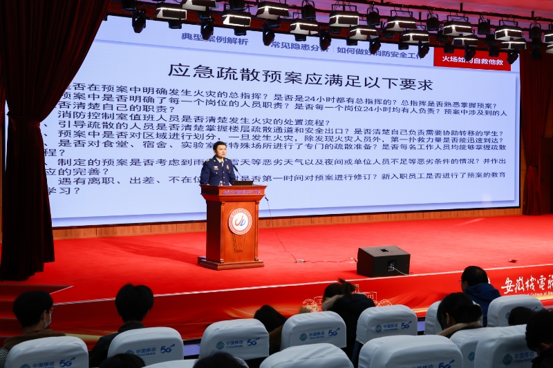 为落实学校2025年消防宣传月活动部署,11月19日下午,学校在文津礼堂举办消防安全专题讲座,弋江区消防救援局参谋兰春华主讲。2025年新进教职工,二级学院、部门安全管理(联络)员、二级学院学生代表、食堂和商业网点全体生活服务工作人员、物业公司宿管和保安工作人员、学校治安消防信息队全体成员参加此次讲座。校园安全管理处副处长章青主持讲座。