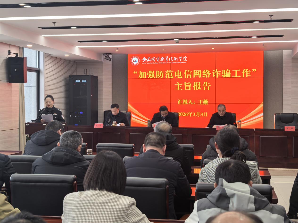 3月3日下午,学校召开2026年第一季度安全稳定和意识形态形势研判会,校党委书记徐春林、党委副书记姜绳出席,党委委员、副院长张强主持会议。芜湖市公安局弋江分局反电诈中心主任王薇应邀到会指导,各党总支书记、副书记及各职能部门主要负责人参加会议。